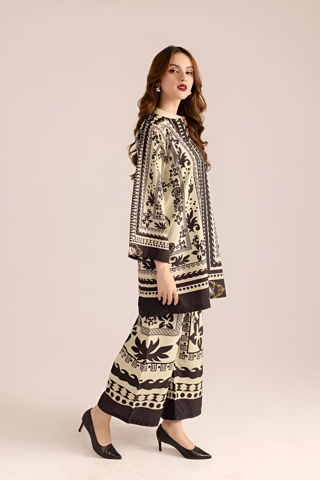 Elevate your wardrobe with Hania Luxe, a beautifully designed 2-piece suit set that merges comfort and style. The straight kurta and wide-leg trousers crafted in a soft beige fabric are accentuated with bold black prints, giving it a sophisticated and modern look. Ideal for semi-formal gatherings, casual outings, or an elevated everyday style, this set brings effortless charisma.